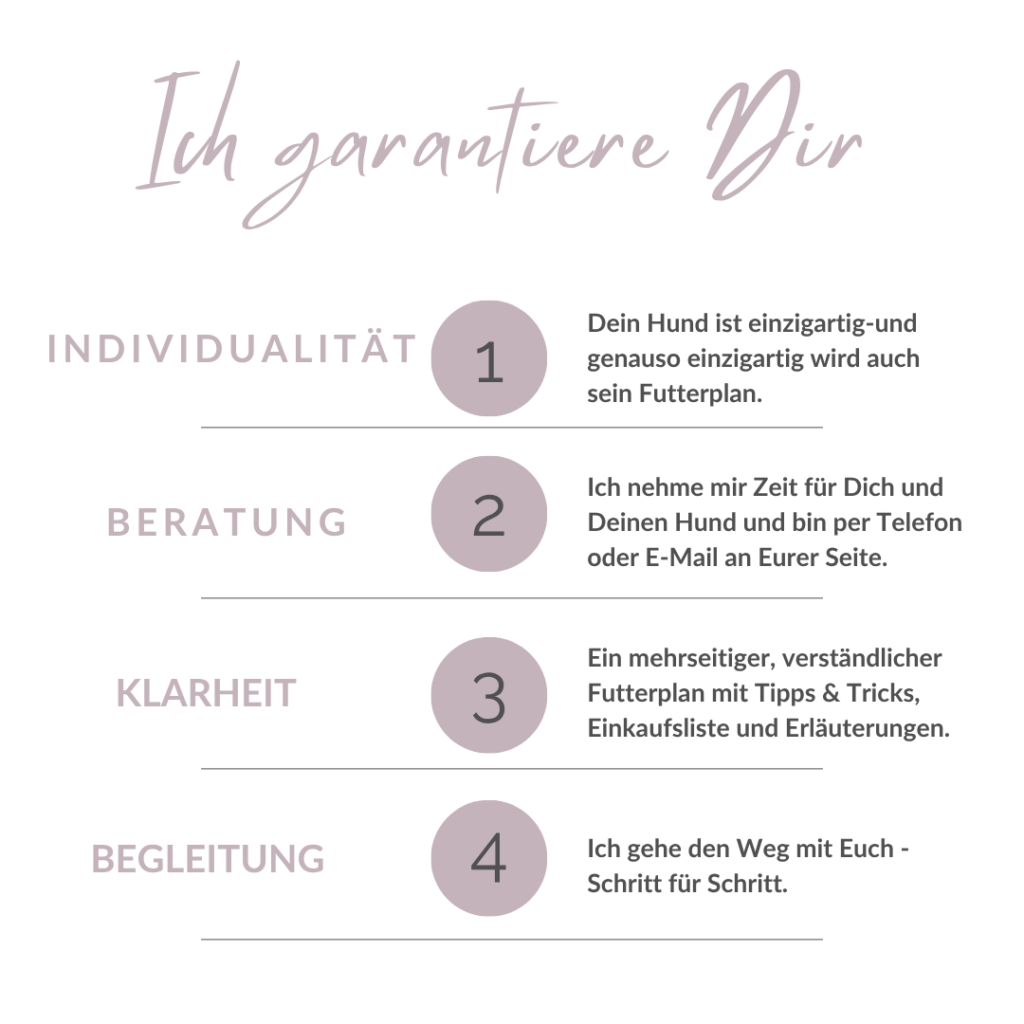 Hunde mit Symptomen wie Durchfall, Juckreiz, Sodbrennen oder Futterunverträglichkeiten zählen nicht als „gesunde Hunde“. Auch sehr mäkelige Hunde oder schlechte Fresser gehören nicht in diesen Bereich. Hier braucht es eine gründlichere Ursachenforschung und eine engere Begleitung. Melde Dich gerne für ein individuelles Angebot.