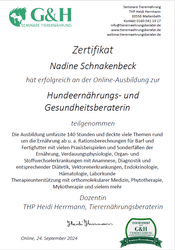 G & H Seminare Tierernährung Hundeernährungs- und Gesundheitsberaterin