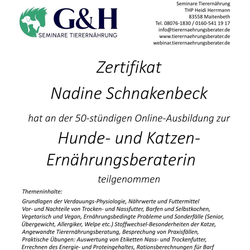 G & H Seminare Tierernährung Ausbildung zur Hunde- und Katzen Ernährungsberaterin